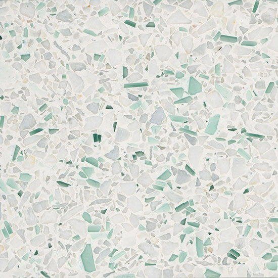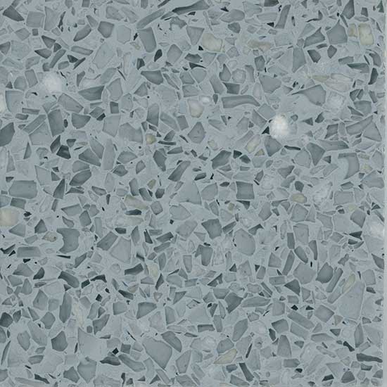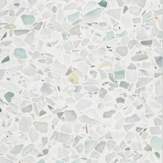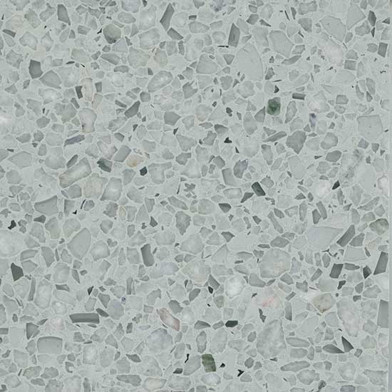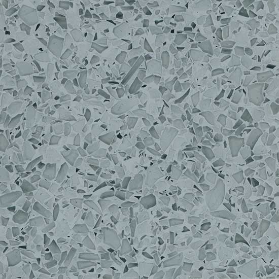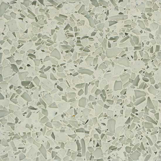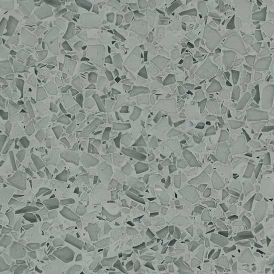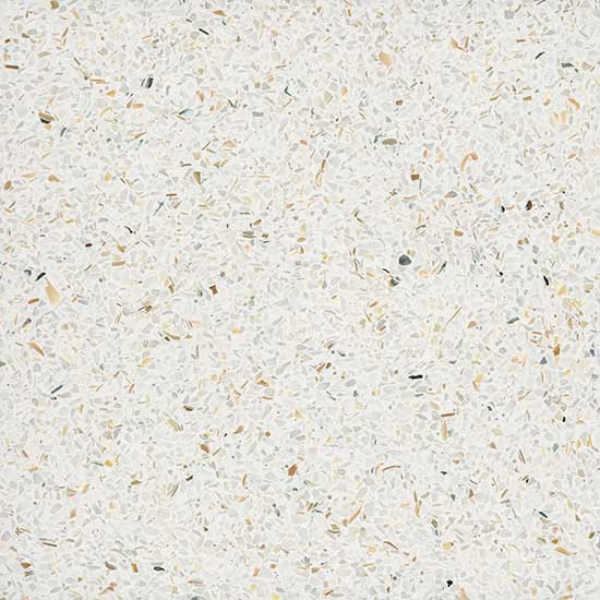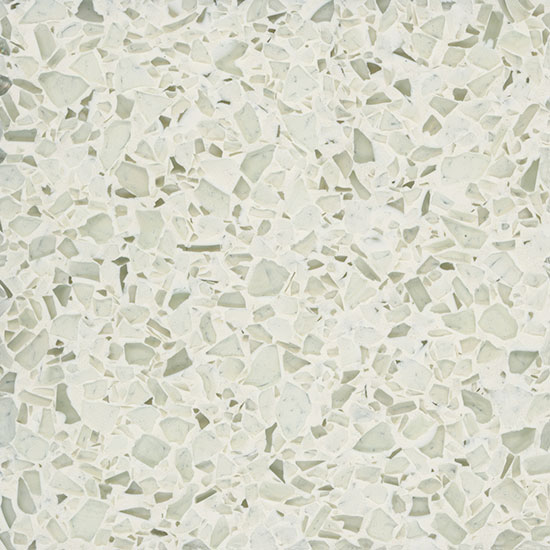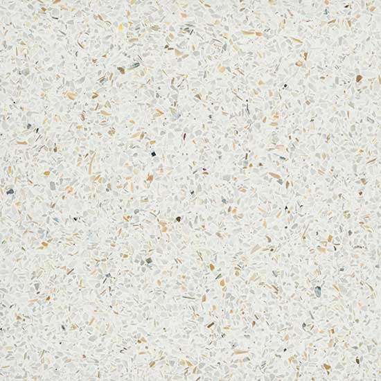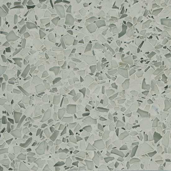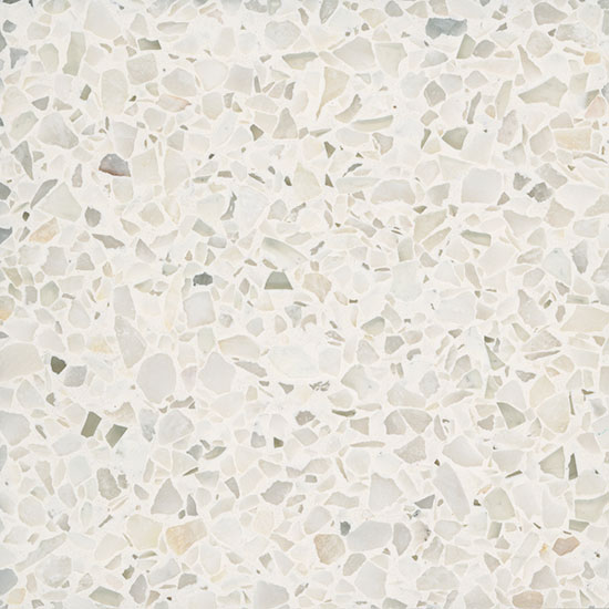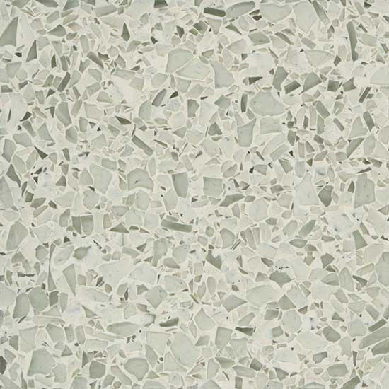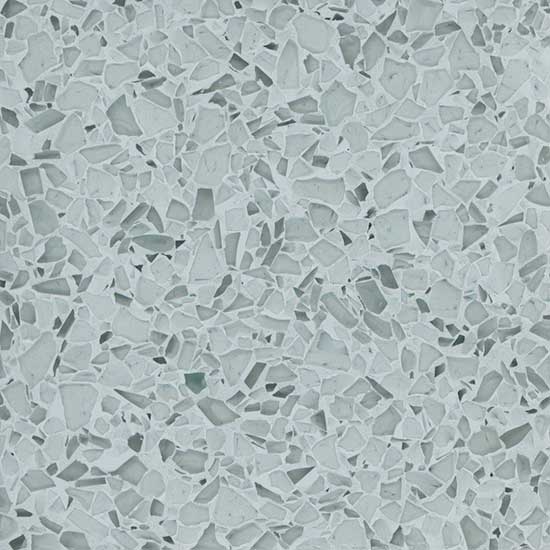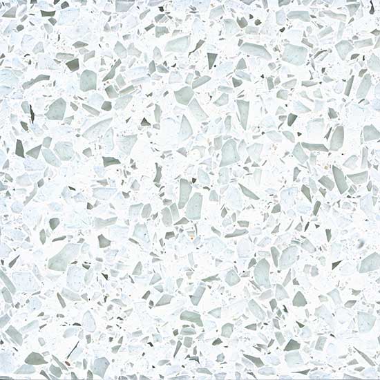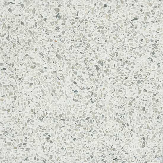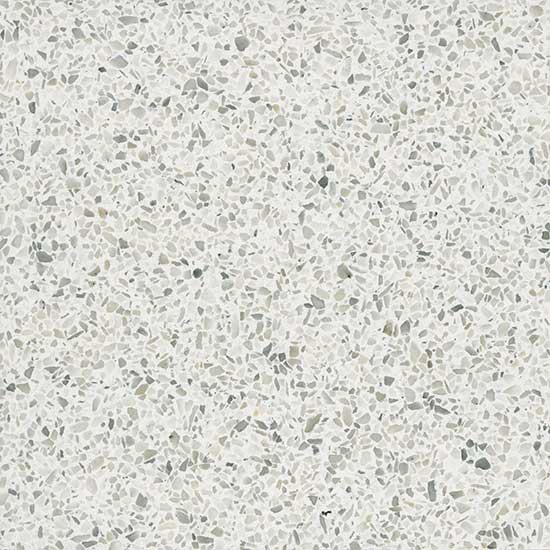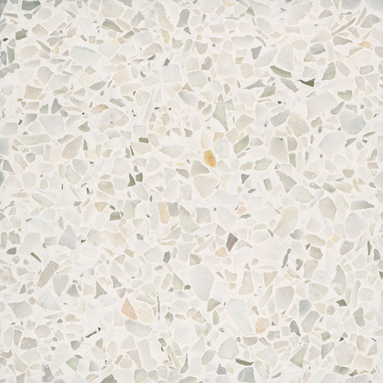 The Clear Series Terrazzo features 100% clear glass chips, set in a colored binder to create a smooth, reflective and visually striking finish. It provides a sophisticated look because of its uniform and monochromatic appeal, making it a good choice for entryways, lobbies, and high-traffic areas.