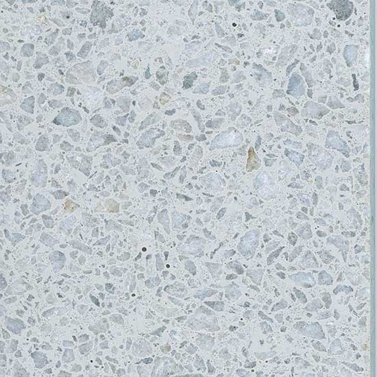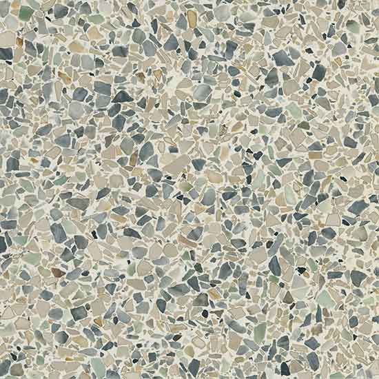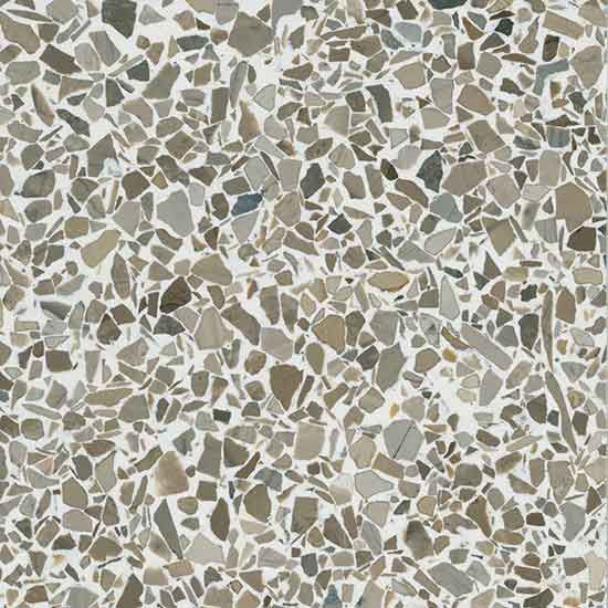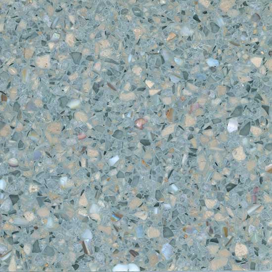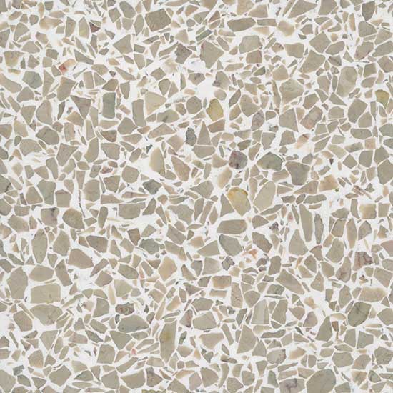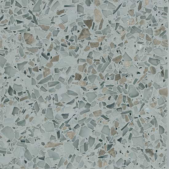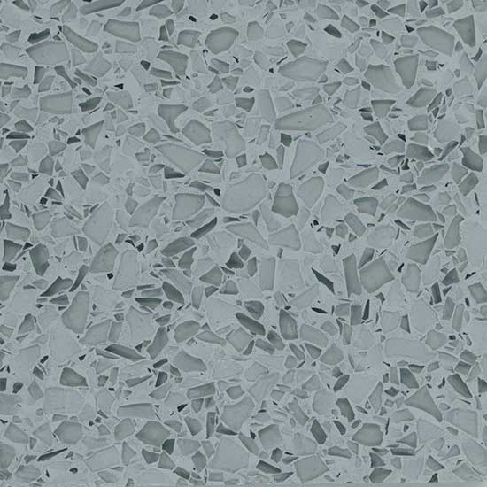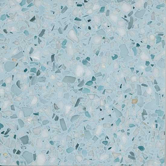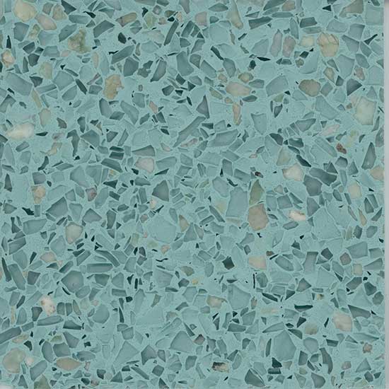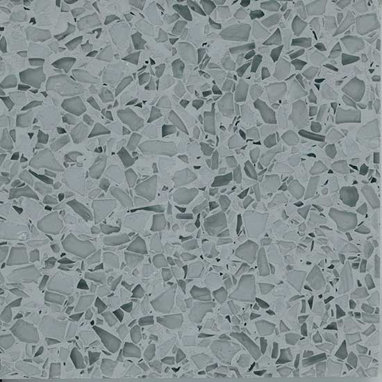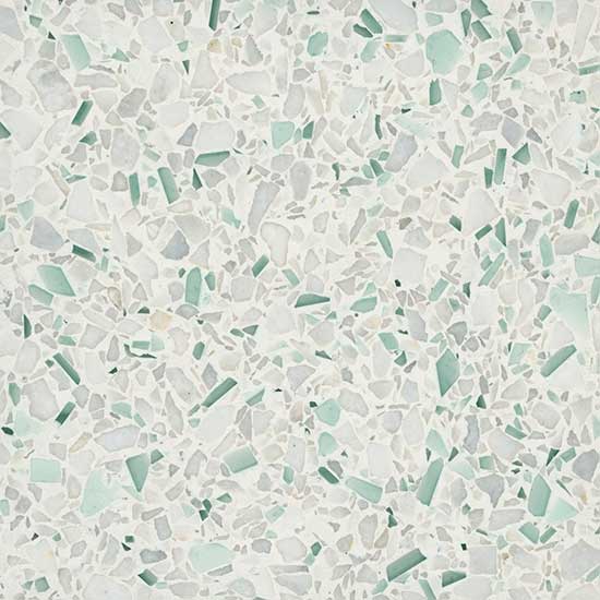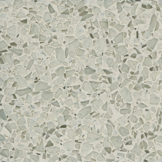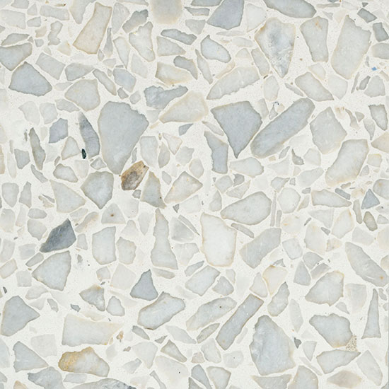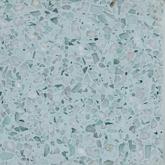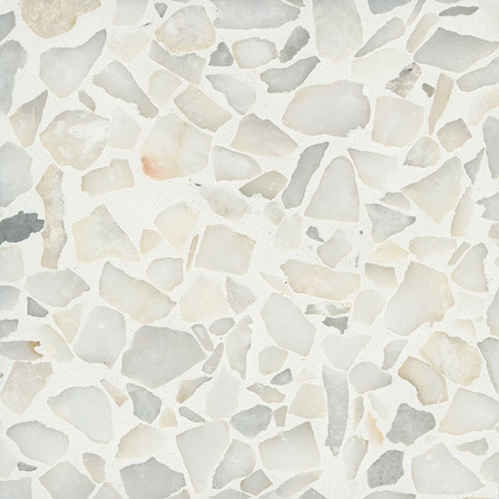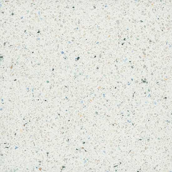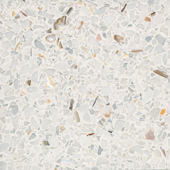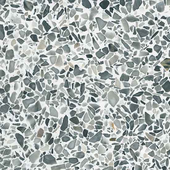 The Clear Series Terrazzo features 100% clear glass chips, set in a colored binder to create a smooth, reflective and visually striking finish. It provides a sophisticated look because of its uniform and monochromatic appeal, making it a good choice for entryways, lobbies, and high-traffic areas.